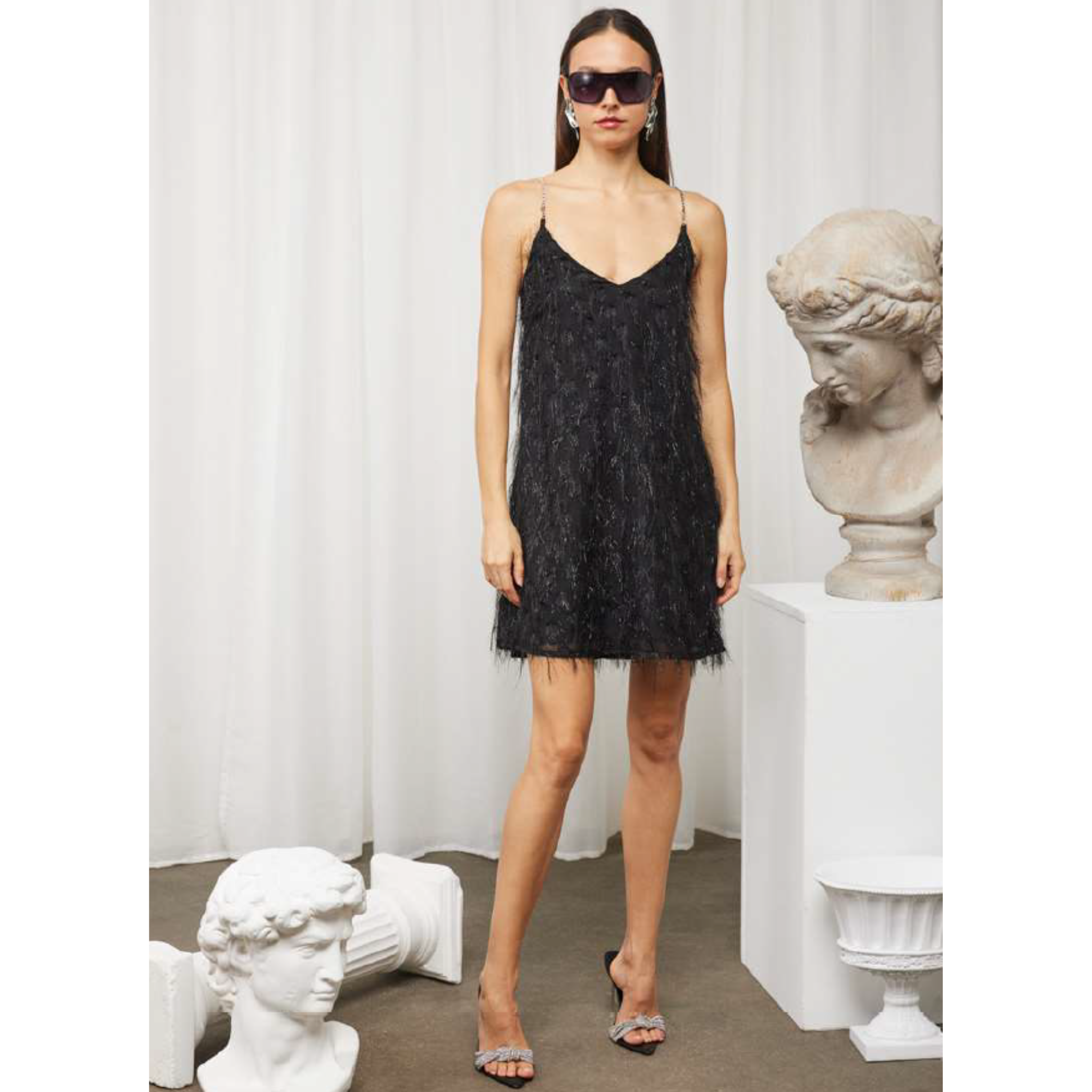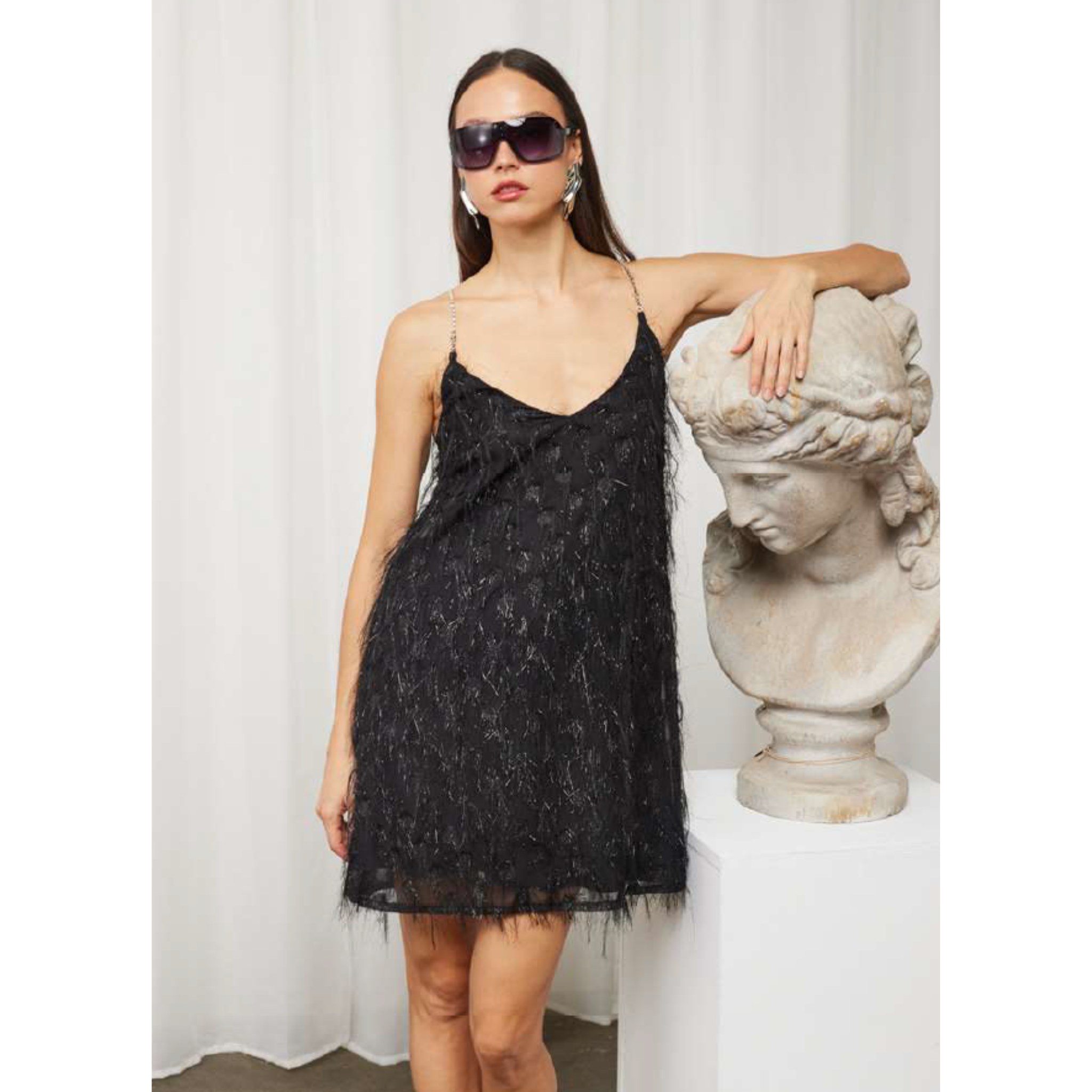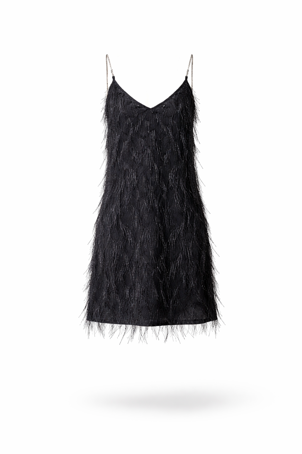Lasciati conquistare dallo stile sofisticato firmato CELYE. Questo abito mini nero è il perfetto equilibrio tra eleganza e carattere, grazie alla lavorazione con frange luminose che creano movimento e riflessi unici. Il design con spalline sottili e scollo a V valorizza la figura con delicatezza, mentre la linea morbida garantisce comfort e vestibilità fluida. Ideale per serate, eventi e occasioni speciali in cui vuoi distinguerti con un look raffinato e contemporaneo.