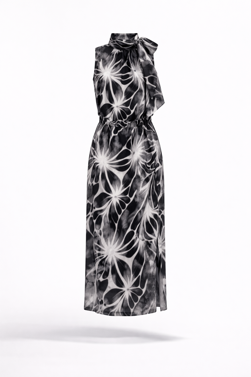 Abito midi elegante firmato Manuela Riva, realizzato in tessuto leggero e fluido con raffinata fantasia floreale nei toni del bianco e nero. Il design senza maniche è valorizzato da un elegante collo alto con fiocco laterale, dettaglio chic che dona movimento e femminilità. La vita leggermente arricciata definisce la silhouette, mentre la lunghezza midi con spacco laterale aggiunge slancio e sensualità al look. Perfetto per occasioni eleganti, eventi e cerimonie, ma anche per outfit sofisticati da giorno. Un capo distintivo e contemporaneo che unisce eleganza, comfort e stile.