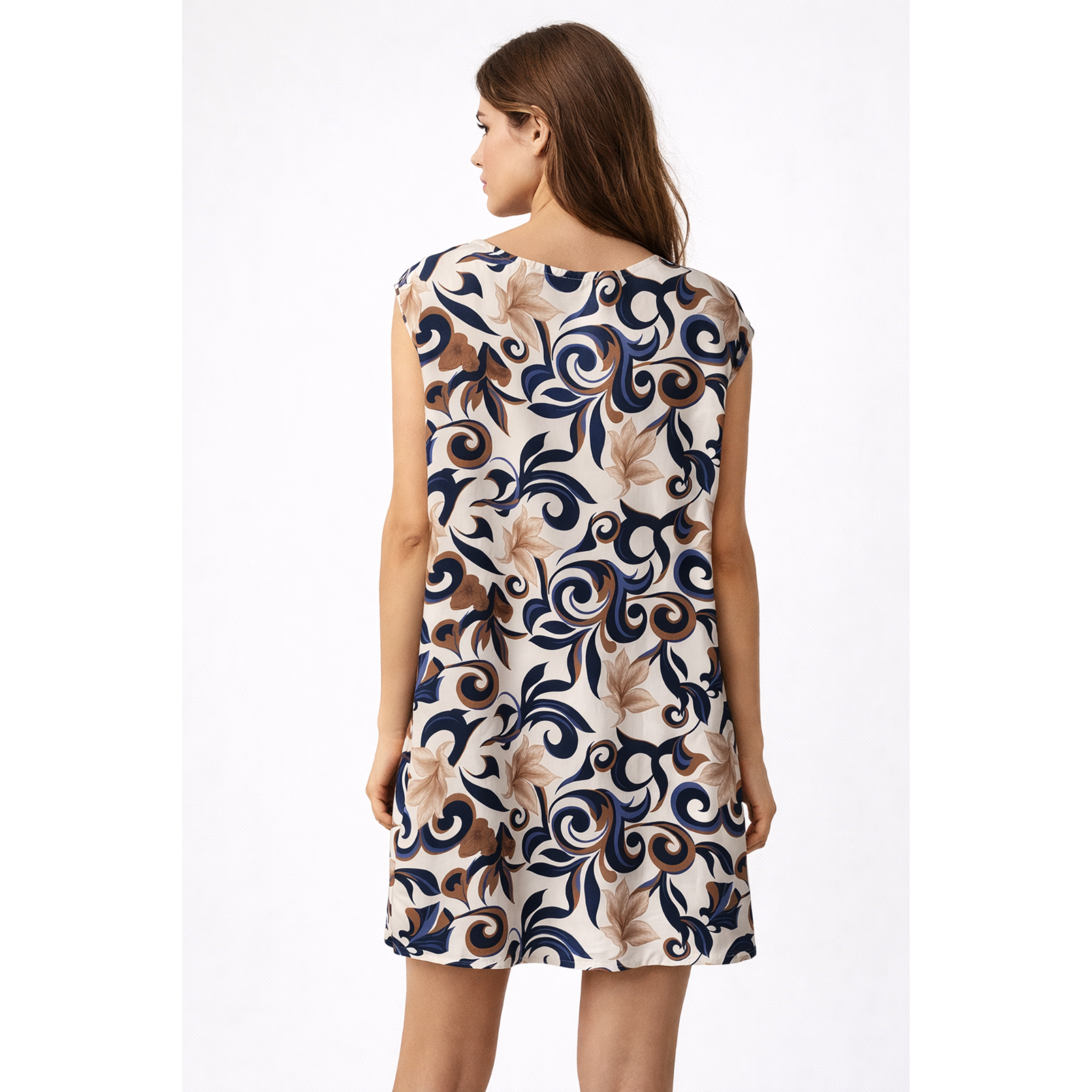 Il tessuto leggero e la linea morbida rendono questo abito ideale per creare look femminili e sofisticati, perfetti sia per il giorno che per occasioni speciali. La fantasia con motivi blu e marrone su base beige dona carattere e originalità al capo, mentre la vestibilità comoda garantisce comfort durante tutta la giornata.