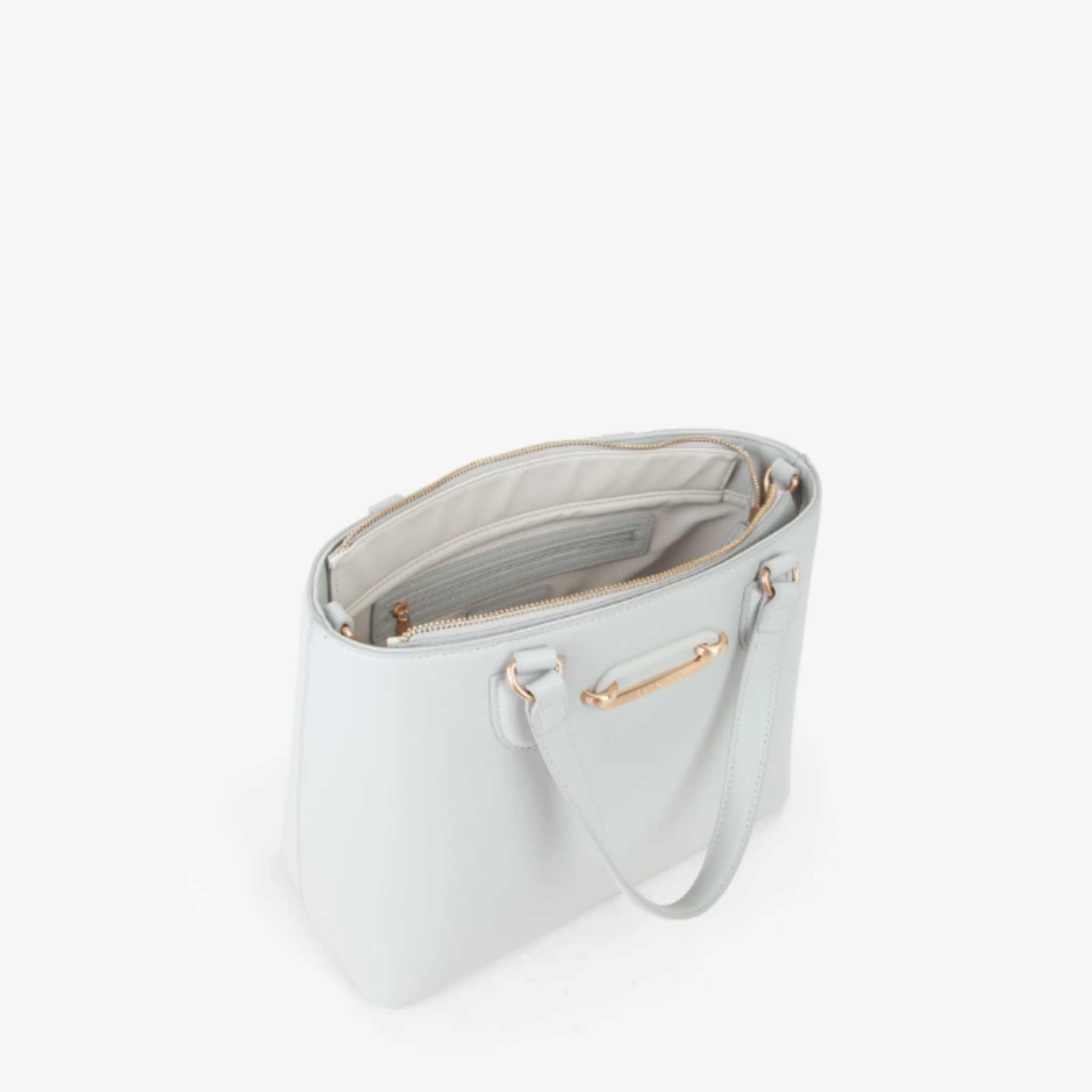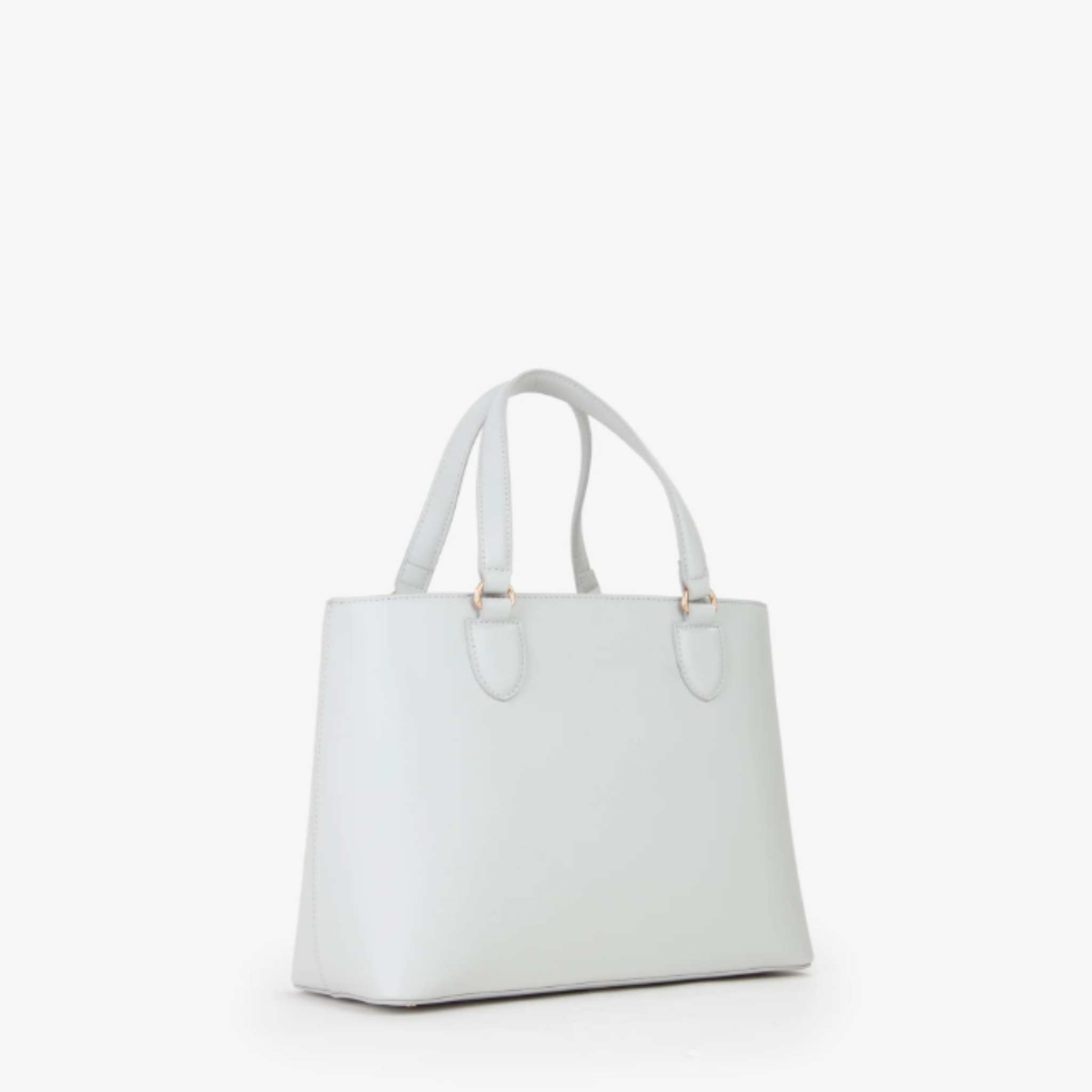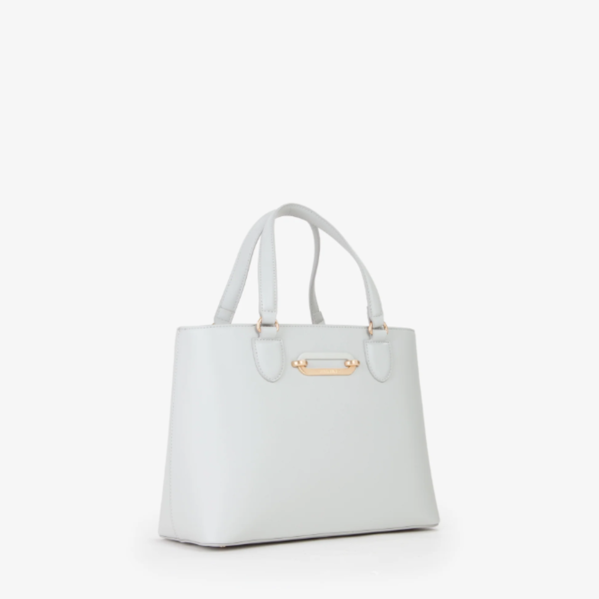 Shopping a mano color ghiaccio con logo inciso su placca bicolore, sul davanti. Dotata di doppi manici e di una tracolla regolabile e removibile, può essere indossata sia a mano che a spalla per la massima versatilità.