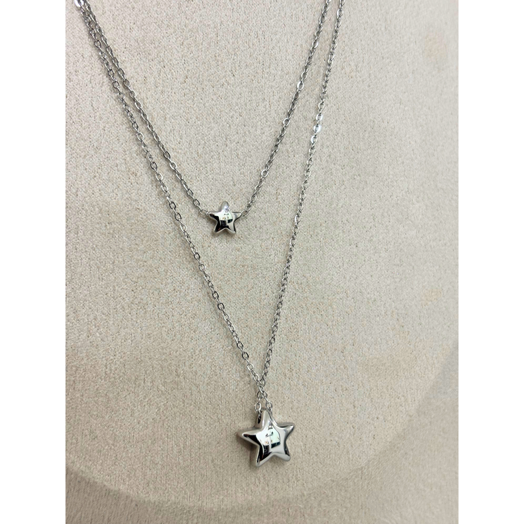 La collana 6TU con doppio pendente a forma di stella è un gioiello moderno e raffinato, perfetto per chi ama uno stile minimal ma ricercato.
