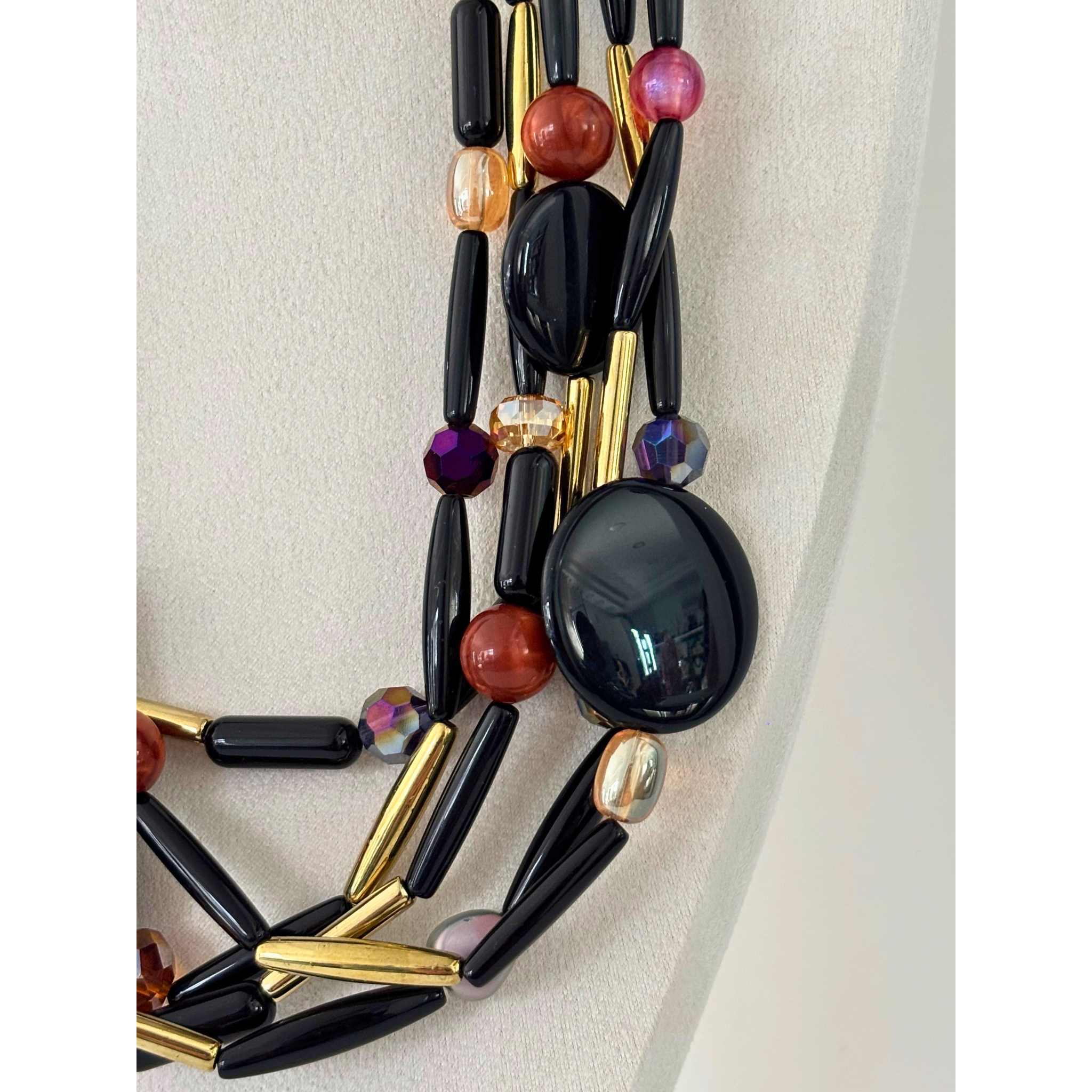 Aggiungi un tocco di eleganza decisa ai tuoi outfit con la collana girocollo Dolman in nero e oro, un accessorio dal carattere moderno e sofisticato. Il design multi-filo combina elementi neri lucidi con dettagli metallici oro e perle decorative dai toni caldi e intensi, dando vita a un equilibrio perfetto tra stile contemporaneo e femminilità.