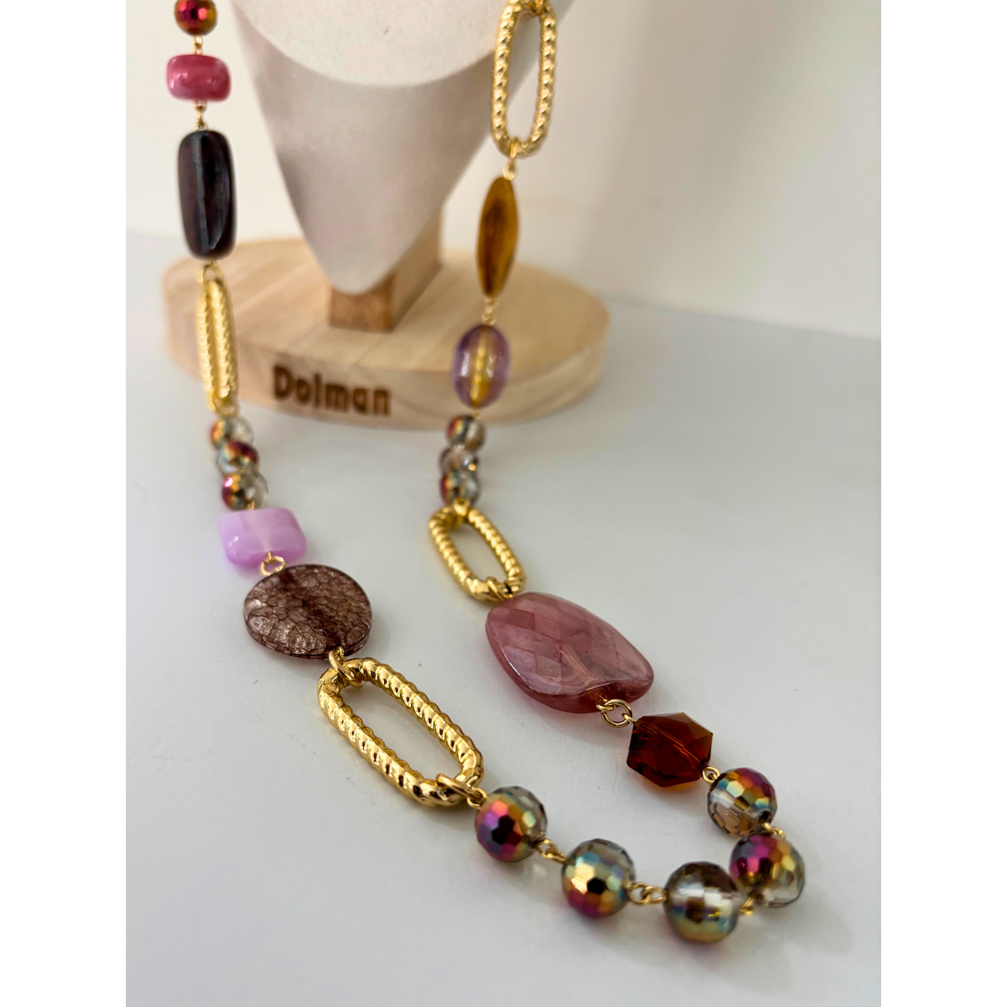 La combinazione armoniosa di tonalità rosa, ametista, ambra e oro crea un effetto sofisticato e femminile. La lunghezza permette di indossarla sia singola che doppia, per un look personalizzato.