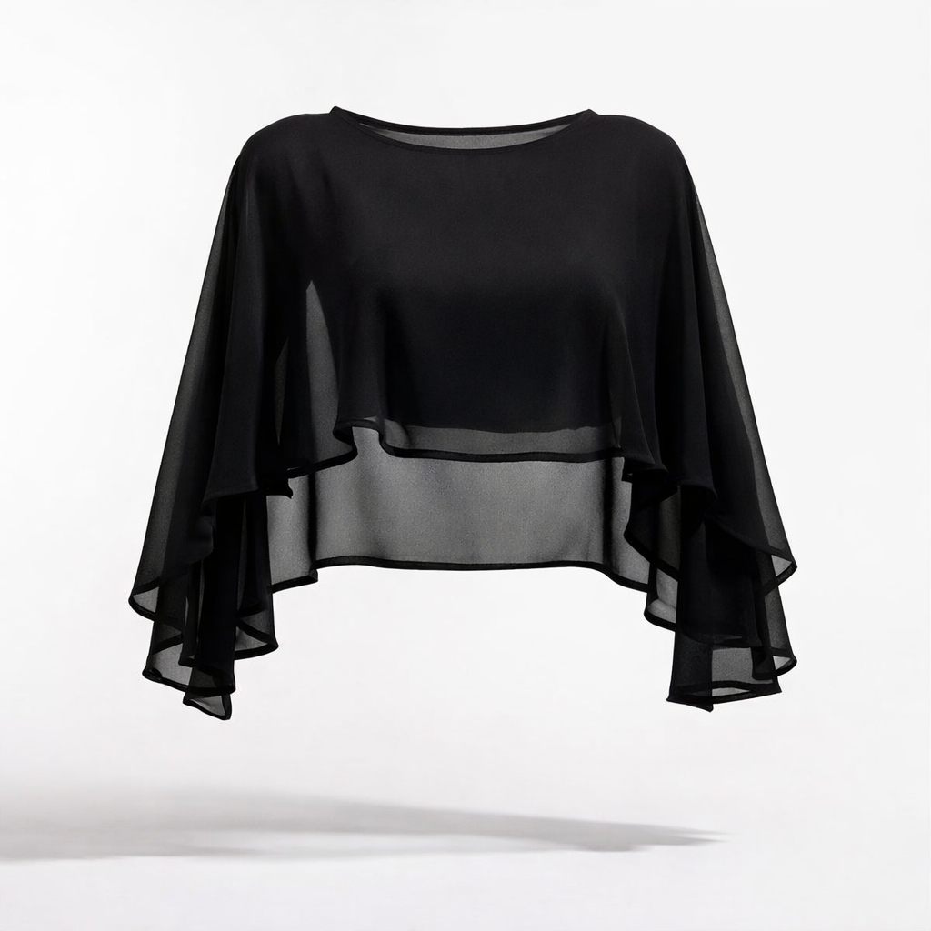 Coprispalle elegante firmato Manuela Riva, realizzato in chiffon leggero e semi-trasparente, ideale per completare look raffinati da sera o cerimonia. Il design fluido con maniche ampie e linea morbida crea un effetto sofisticato e femminile, valorizzando ogni outfit senza appesantire la silhouette. Perfetto da abbinare ad abiti eleganti o outfit minimal, questo coprispalle nero rappresenta un capo versatile e senza tempo, pensato per aggiungere un tocco di classe e movimento. Un must-have per occasioni speciali, eventi e serate eleganti.