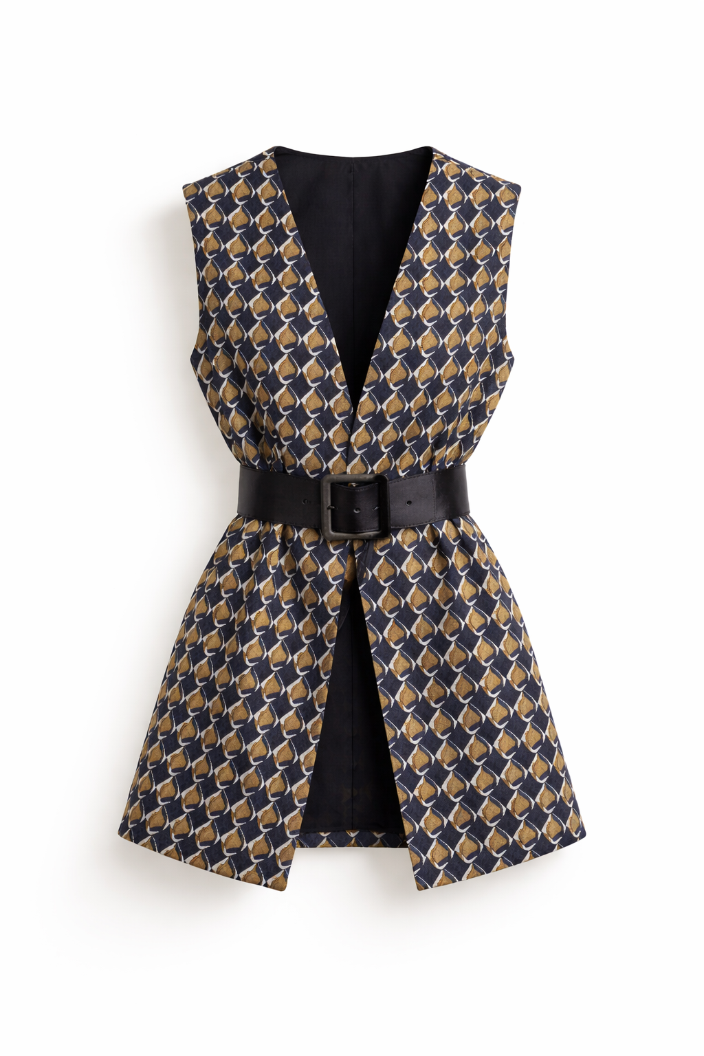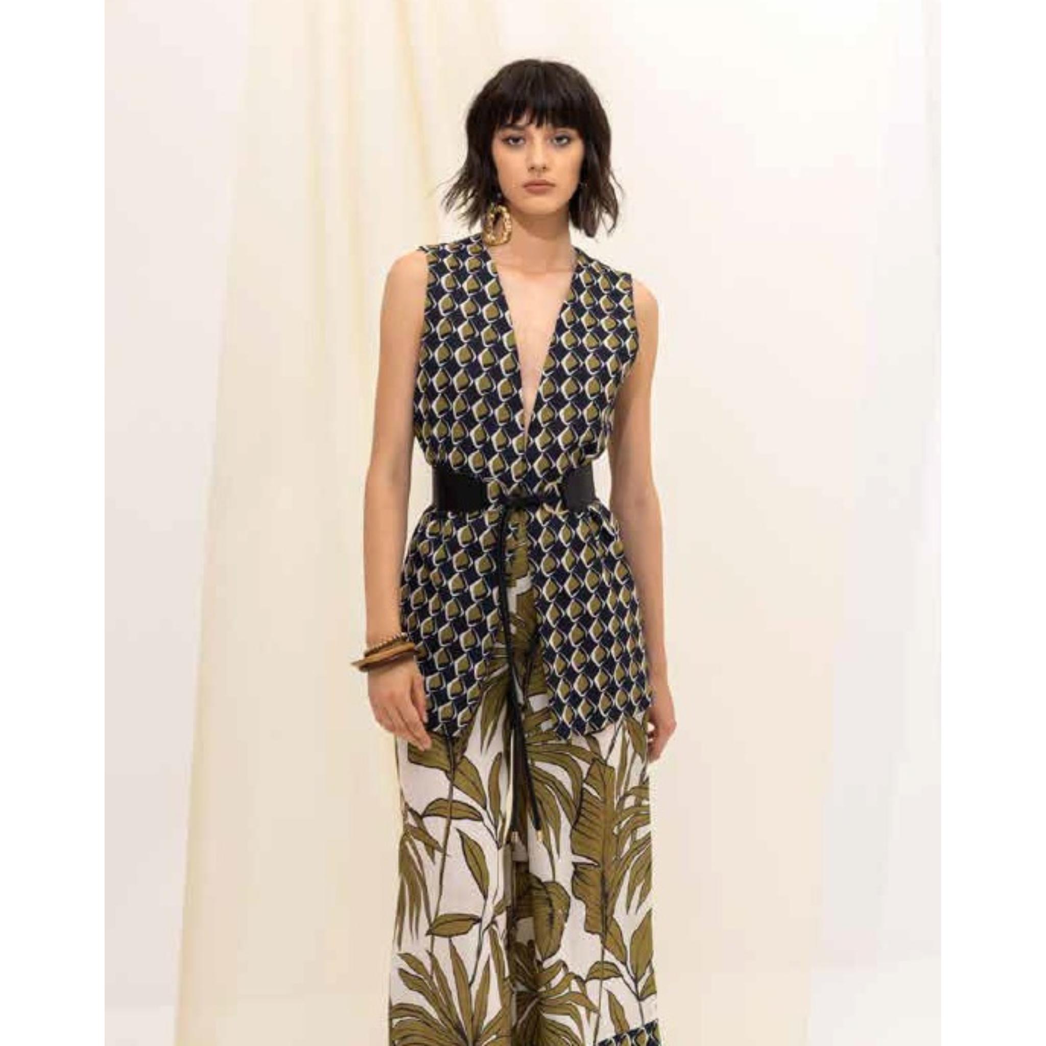 Il gilet donna Manuela Riva è un capo elegante e contemporaneo, perfetto per creare look distintivi e raffinati. Caratterizzato da una fantasia geometrica nei toni del nero e oro, questo gilet senza maniche presenta un profondo scollo a V che valorizza la silhouette.