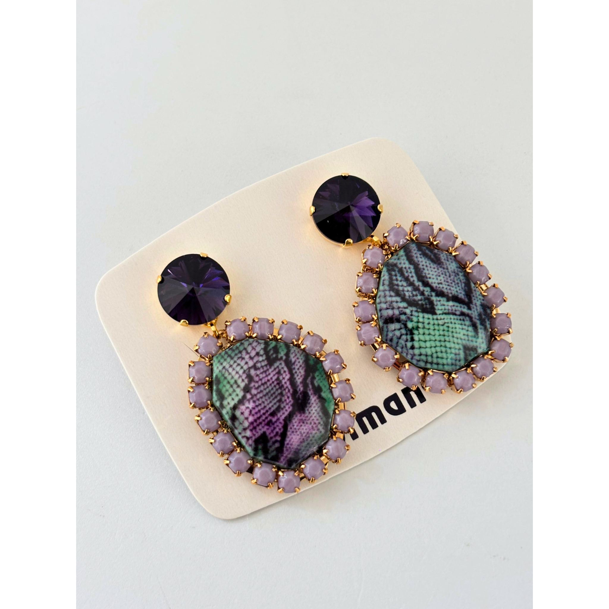Gli Orecchini Dolman combinano audacia e raffinatezza in un design unico. Il pendente ovale, con effetto pitonato nei toni del verde, viola e nero, è incorniciato da piccoli cristalli color lilla che donano luce e movimento.