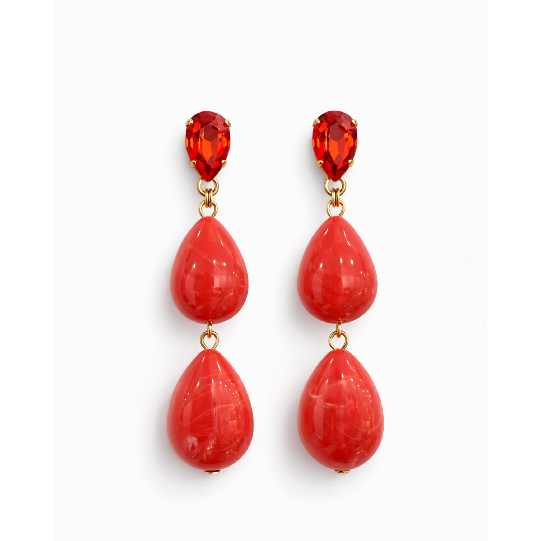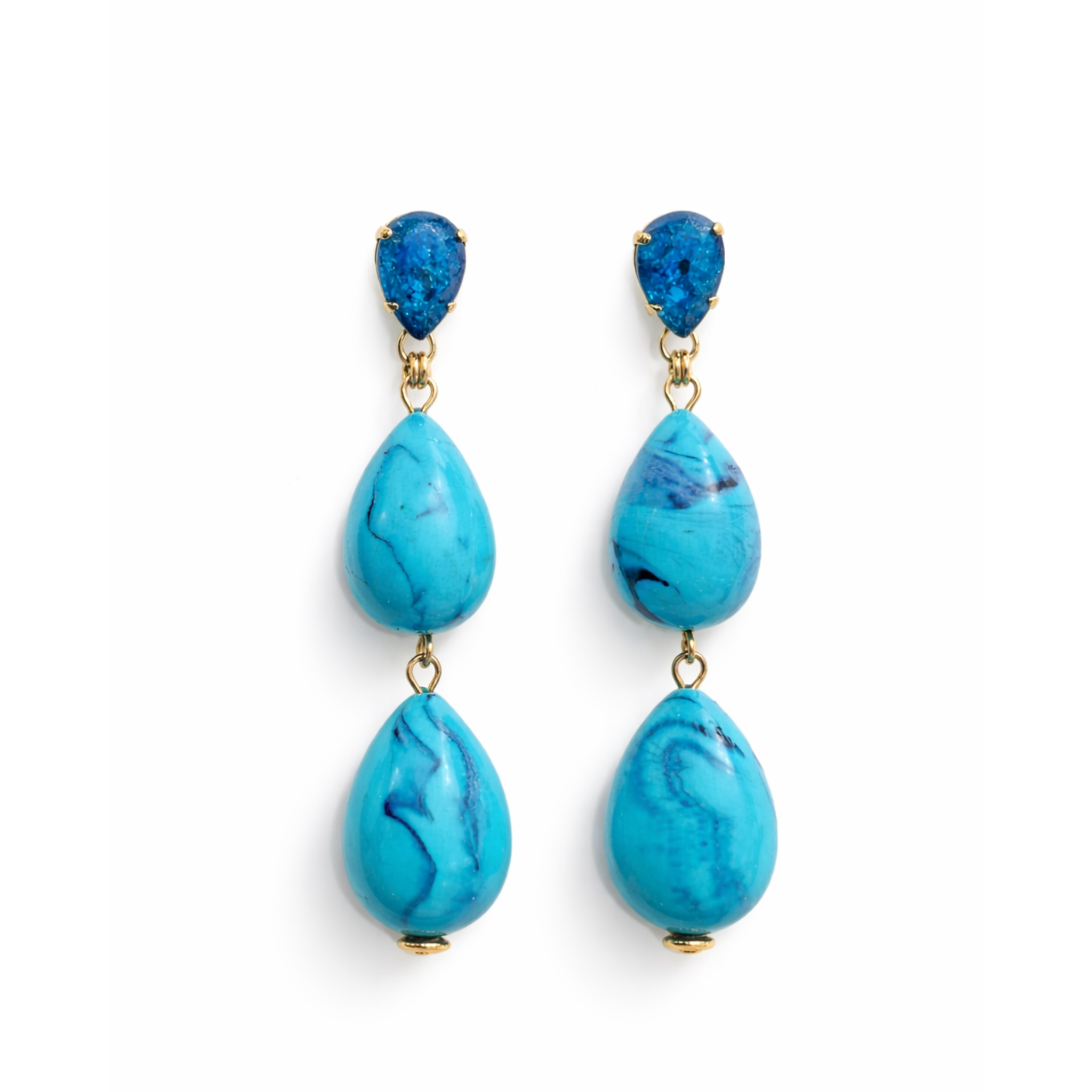 Orecchini firmati Paviè, dal design raffinato e contemporaneo, caratterizzati da una doppia goccia con venature naturali e punto luce superiore. La struttura leggera e i dettagli dorati donano movimento e luminosità, rendendoli perfetti sia per il giorno che per occasioni speciali.